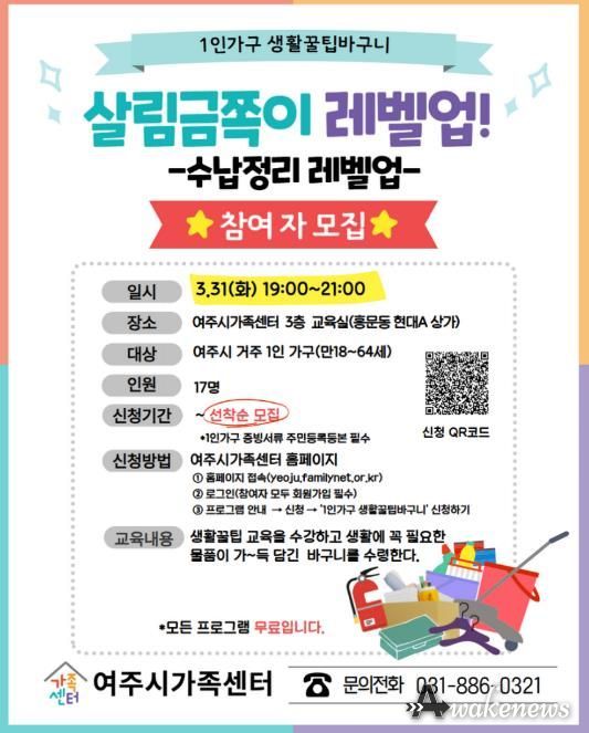 어웨이크뉴스 오경하 기자 | 여주시가족센터는 여주시에 거주하는 1인 가구의 자립 역량 강화하고 생활 안정을 돕기 위해 '1인 가구 생활꿀팁 바구니’프로그램 참여자를 모집한다고 밝혔다.
