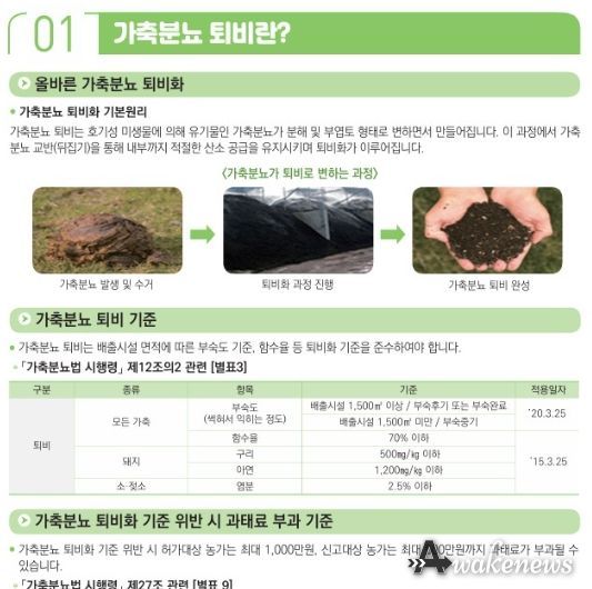 관내 축산농가 중 허가대상은 연 2회, 신고대상은 연 1회 검사 의무화 '가축분뇨의 관리 및 이용에 관한 법률'에 따라 가축분뇨 배출시설 설치 및 운영자, 퇴·액비를 처리·살포하는 자는 반드시 부숙도 검사를 실시해야 한다. 특히, 퇴·액비를 외부로 반출할 때는 반드시 부숙도 검사를 완료하고 '부숙완료' 판정을 받은 퇴비만을 반출해야 법적 불이익을 피할 수 있으며, 검사를 희망하는 농가는 퇴비 더미 중 5~10군데에서 2㎏ 이상 채취해 균일하게 혼합 후 500g 가량을 정해진 시료 봉투에 담아 여주시 농업기술센터 내 종합검정실 2층에 방문·의뢰하면 무료로 검사결과를 받을 수 있다.