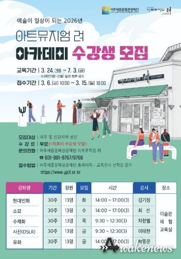 어웨이크뉴스 오경하 기자 | 여주세종문화관광재단 아트뮤지엄 려에서 2026년 3월 6일 ~ 3월 15일 동안 아트뮤지엄 려 아카데미 강좌 수강생을 모집한다고 밝혔다.