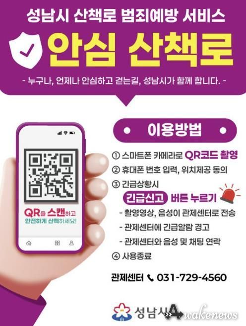 어웨이크뉴스 오경하 기자 | 성남시는 시민들이 보다 안심하고 산책로를 이용할 수 있도록 영장산과 불곡산 일대 산책로에 ‘범죄예방 서비스’를 6일부터 도입한다.