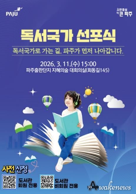 어웨이크뉴스 오경하 기자 | 파주시는 오는 11일 15시, 파주출판도시 지혜의숲 대회의실에서 ‘파주시 독서국가 선포식’을 개최하고 책 읽는 도시를 넘어 ‘독서국가’로 나아가기 위한 힘찬 출발을 알린다.