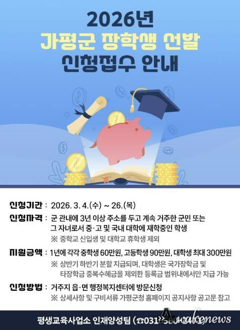 어웨이크뉴스 오경하 기자 | 가평군이 지역 학생들의 균등한 교육 기회를 보장하고 우수 인재를 육성하기 위해 2026년도 장학생 선발에 나선다.