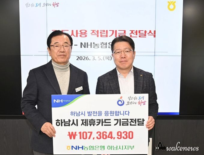 어웨이크뉴스 오경하 기자 | NH농협은행 하남시지부가 5일 제휴카드 사용 적립기금 107,364,930원 하남시에 전달했다고 밝혔다.