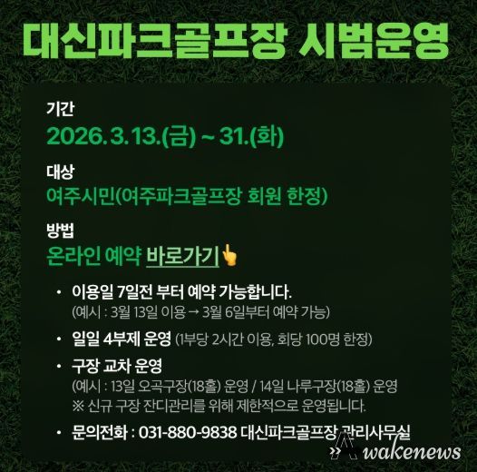 어웨이크뉴스 오경하 기자 | 여주도시공사는 남한강의 수려한 경관과 천연잔디의 푸름을 만끽할 수 있는 대신파크골프장의 정식 개장을 앞두고, 오는 3월 13일부터 31일까지 여주시민을 위한 시범운영을 실시한다고 밝혔다.