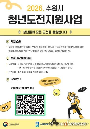 어웨이크뉴스 오경하 기자 | 수원시청소년청년재단 수원시청년지원센터는 취업 준비 과정에서 어려움을 겪고 있는 청년을 대상으로 ‘2026 수원시 청년도전지원사업’ 참여자 130명을 모집한다고 6일 밝혔다.