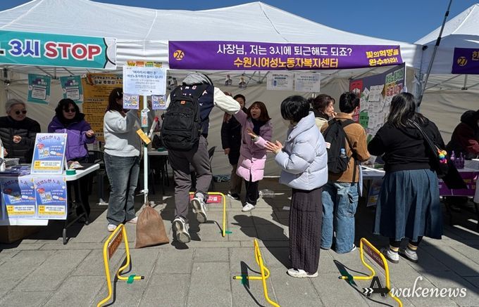 어웨이크뉴스 오경하 기자 | 수원시 여성노동자복지센터는 7일 광화문 서십자각에서 열린 ‘제41회 한국여성대회’ 현장에서 시민을 대상으로 ‘일·생활 균형 인식개선 캠페인’을 펼쳤다.