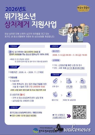 어웨이크뉴스 오경하 기자 | 경기도가 자해 상처, 폭력 피해 문신 등으로 신체적·심리적 어려움을 겪는 청소년을 돕기 위해 오는 20일까지 ‘위기청소년 상처제거 지원사업’의 상반기 신청자를 접수한다.