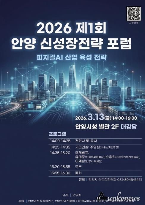 어웨이크뉴스 오경하 기자 | 안양시는 미래 신산업 육성과 지역 산업 경쟁력 강화를 모색하기 위한 ‘2026 제1회 안양 신성장전략 포럼’을 이달 13일 오후 2시 안양시청 별관 2층 대강당에서 개최한다고 9일 밝혔다.