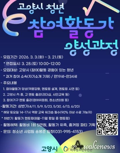 어웨이크뉴스 오경하 기자 | 고양시청소년재단 마두청소년수련관은 고양시에서 다양한 참여 활동을 경험한 청년들을 전문적인 역량을 갖춘 멘토로 육성하는 ‘2026 고양시 청년참여활동가 양성과정’ 참가자를 모집한다.