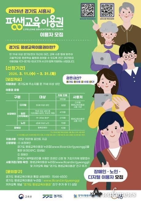 어웨이크뉴스 오경하 기자 | 시흥시는 시민들의 평생학습 기회를 확대하기 위해 ‘2026년 제1차 경기도 평생교육이용권’ 신청을 오는 3월 11일 오전 10시부터 3월 31일 오후 6시까지 받는다.