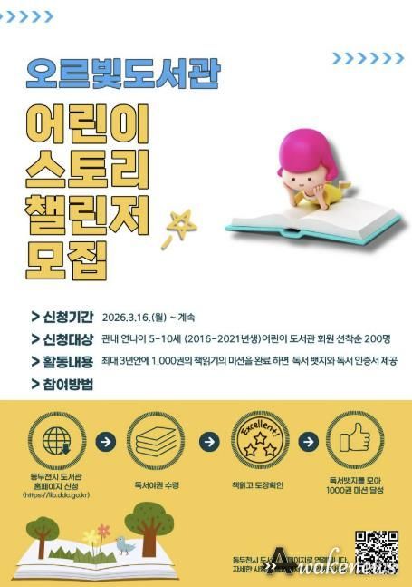 어웨이크뉴스 오경하 기자 | 동두천시 도서문화사업소는 3월 16일부터 관내 5-10세 어린이를 대상으로 ‘어린이 스토리 챌린저’ 참여자를 모집한다고 밝혔다. 이번 사업은 어린이의 자발적인 독서 습관 형성과 ‘책 읽는 동두천’ 분위기 조성 및 독서문화 확산을 위해 마련했다.