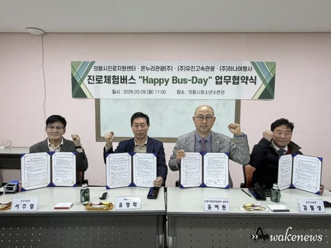 어웨이크뉴스 오경하 기자 | 의왕시청소년재단 산하 의왕시진로지원센터 ‘꿈터’가 청소년들의 진로 탐색을 지원하기 위해 3월 9일 관내 운수업체와 ‘진로체험버스’ 운영을 위한 업무협약(MOU)을 체결했다.