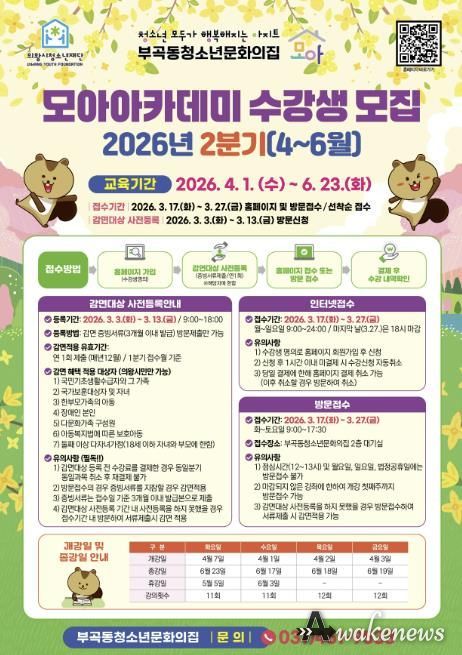 어웨이크뉴스 오경하 기자 | (재)의왕시청소년재단 부곡동청소년문화의집이 청소년들의 창의성과 실천 역량을 키우는 배움의 장을 조성하기 위해‘2026년 모아아카데미 2분기(4~6월)’ 수강생을 모집한다.