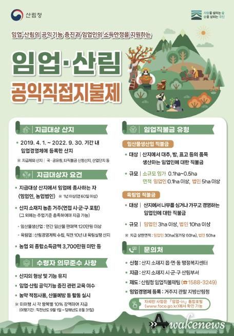 지급 대상은 2019년 4월 1일부터 2022년 9월 30일 사이 임야를 대상으로 농업경영체 등록을 한 산지다. 직불금을 받기 위해서는 산지의 형상과 기능을 유지하고 산림경영계획을 준수하는 등 산림의 공익 기능 증진을 위한 의무사항을 이행해야 한다.