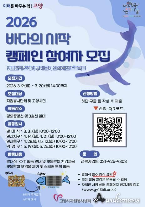 어웨이크뉴스 오경하 기자 | 고양시자원봉사센터는 빗물받이 쓰레기 무단 투기 금지 및 인식 개선을 위해 ‘2026년 바다의 시작 캠페인’ 참여자를 모집한다고 10일 밝혔다.