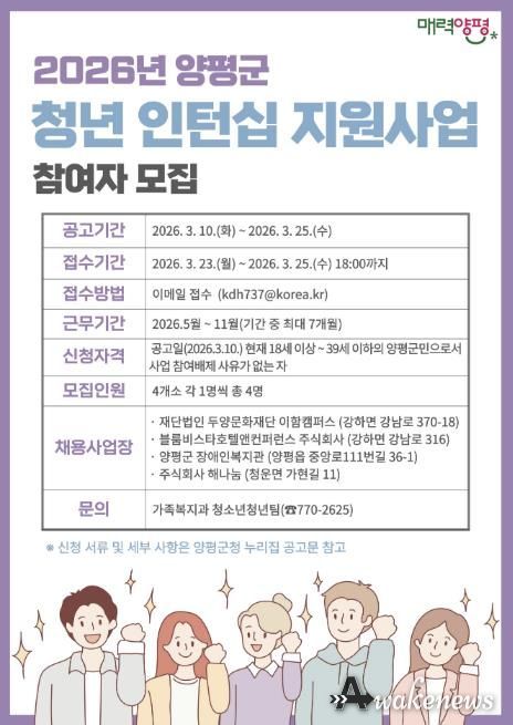 어웨이크뉴스 오경하 기자 | 양평군은 인력이 필요한 관내 사업장과 미취업 청년을 연계하고 사업장에 인건비를 지원하는 ‘2026년 양평군 청년 인턴십 지원 사업’ 참여자를 모집한다고 10일 밝혔다.