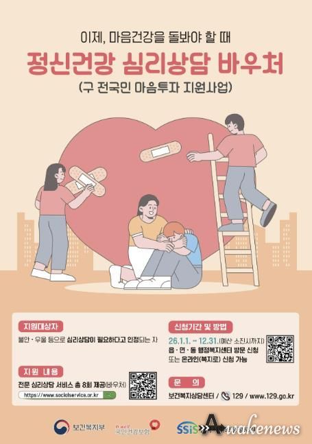 정신건강 심리 상담 바우처 지원 대상은 △정신건강복지센터·청소년상담복지센터·Wee센터·Wee클래스·정신의료기관 등에서 심리상담이 필요하다고 인정된 군민 △국가건강검진 정신건강검사에서 중간 정도 이상의 우울이 확인된 군민 △자립준비청년 및 보호연장아동 등이다. 신청을 희망하는 군민은 주소지 읍면사무소를 방문하거나 ‘복지로’를 통해 온라인으로 신청할 수 있다.