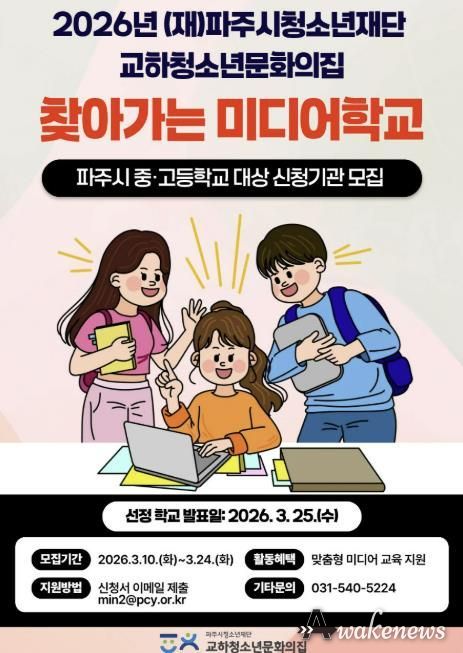어웨이크뉴스 오경하 기자 | (재)파주시청소년재단 교하청소년문화의집은 파주시 청소년의 미디어 이해력 향상과 디지털 역량 강화를 위해 ‘2026년 찾아가는 미디어학교’ 프로그램에 참여할 중·고등학교를 모집한다고 밝혔다.