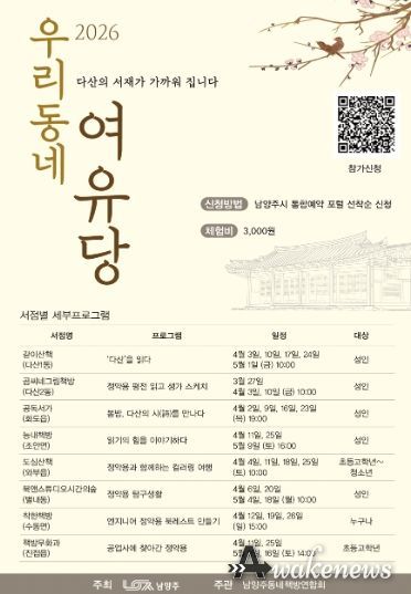 어웨이크뉴스 오경하 기자 | 남양주시는 오는 27일부터 시민이 생활과 밀접한 동네 책방에서 다산 정약용을 접할 수 있도록 ‘우리동네 여유당’ 프로그램을 운영한다고 10일 밝혔다.