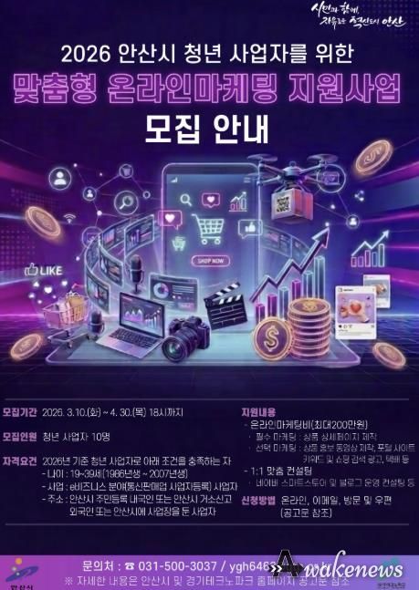 어웨이크뉴스 오경하 기자 | 안산시는 온라인 시장에서 상품 홍보와 매출 확대를 희망하는 청년 사업자를 대상으로 ‘맞춤형 온라인마케팅 지원사업’ 참여자를 모집한다고 11일 밝혔다.