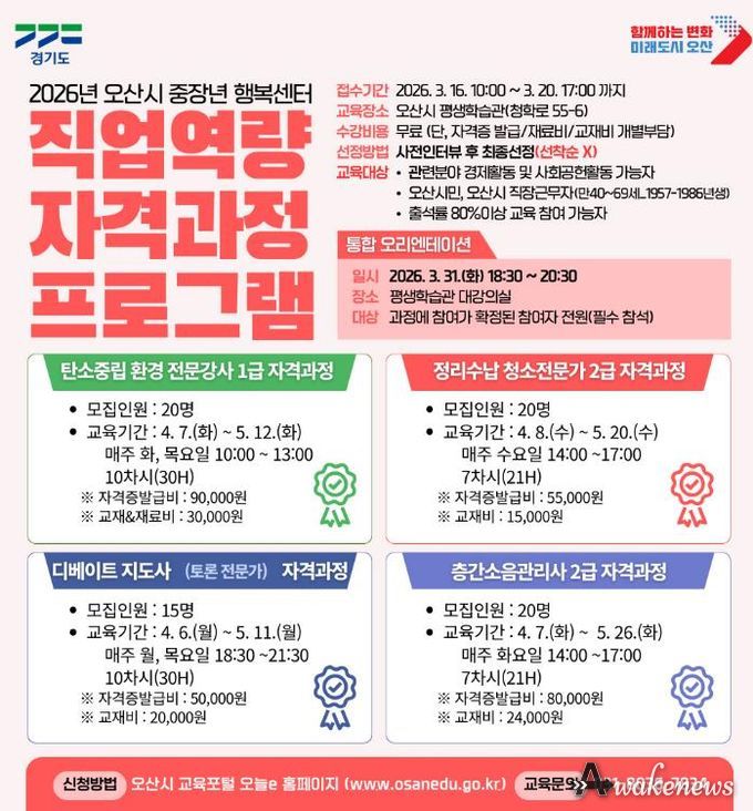 어웨이크뉴스 오경하 기자 | 오산시는 중장년층의 경제활동 참여 확대와 사회공헌 기회 제공을 위해 ‘2026년 오산시 중장년 행복센터 직업역량 자격과정 프로그램’ 수강생을 모집한다고 밝혔다.
