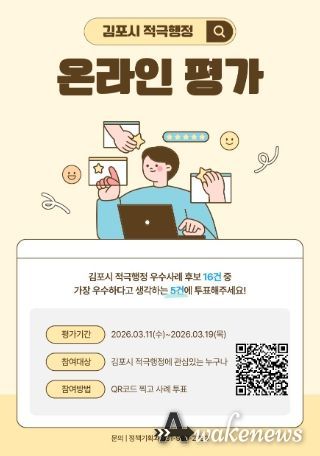 어웨이크뉴스 오경하 기자 | 김포시는 3월 11일부터 3월 19일까지 ‘2026년 제1차 적극행정 우수공무원 선발’을 위한 온라인 평가를 진행한다.