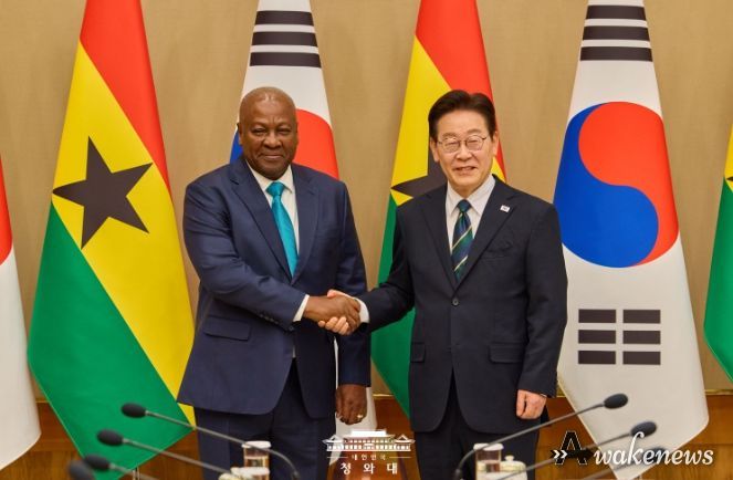 어웨이크뉴스 오경하 기자 | 이재명 대통령은 11일 오후 우리나라를 실무 방한한 존 드라마니 마하마 가나 대통령과 정상회담을 가졌다고 강유정 청와대 대변인이 서면 브리핑을 통해 밝혔다.