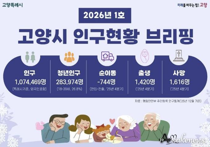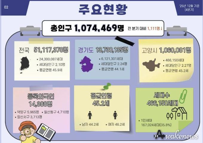 어웨이크뉴스 오경하 기자 | 고양특례시가 저출생·고령화 등 급변하는 인구구조 변화에 선제적으로 대응하기 위해 ‘고양시 인구현황 브리핑’을 운영한다. 시는 인구 규모와 연령구조, 출생·사망, 인구이동 등 주요 지표를 행정동 단위까지 세분화해 인포그래픽으로 시각화하고, 이를 시청 홈페이지 행정자료방을 통해 정례적으로 공개할 계획이다.
