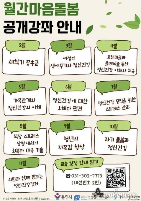 어웨이크뉴스 오경하 기자 | 용인특례시는 용인시정신건강복지센터 주관으로 시민 정신건강 증진을 위한 ‘월간 마음돌봄 공개강좌’ 3월 과정을 19일 용인시정신건강복지센터 영덕분소에서 진행한다고 13일 밝혔다.