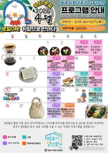 어웨이크뉴스 오경하 기자 | 파주시청년공간 지피(GP)1939가 19~39세 청년(고3 포함)을 대상으로 4월 프로그램 참가자를 모집한다.