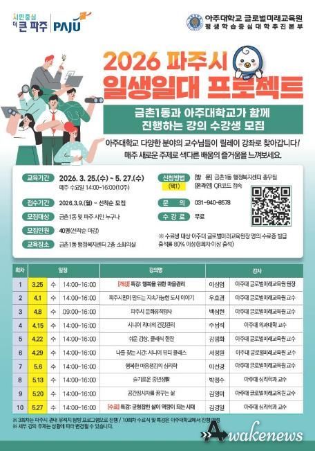어웨이크뉴스 오경하 기자 | 파주시 금촌1동은 오는 25일부터 아주대학교와 연계한 평생교육 프로그램 ‘일생일대 프로젝트’를 운영한다.