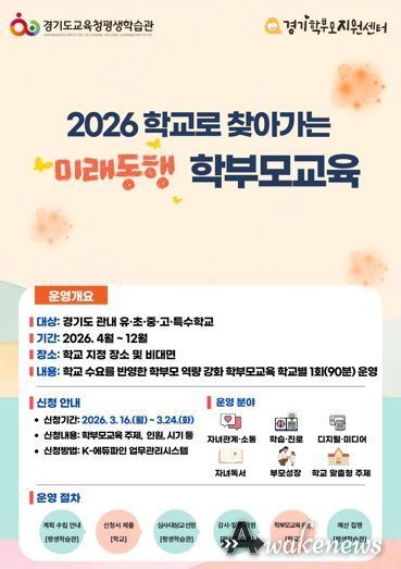 어웨이크뉴스 오경하 기자 | 경기도교육청평생학습관이 자녀교육의 학부모 참여 활성화와 학교-학부모 간 소통‧협력 강화를 위해 ‘2026 학교로 찾아가는 미래동행 학부모교육’을 운영한다.