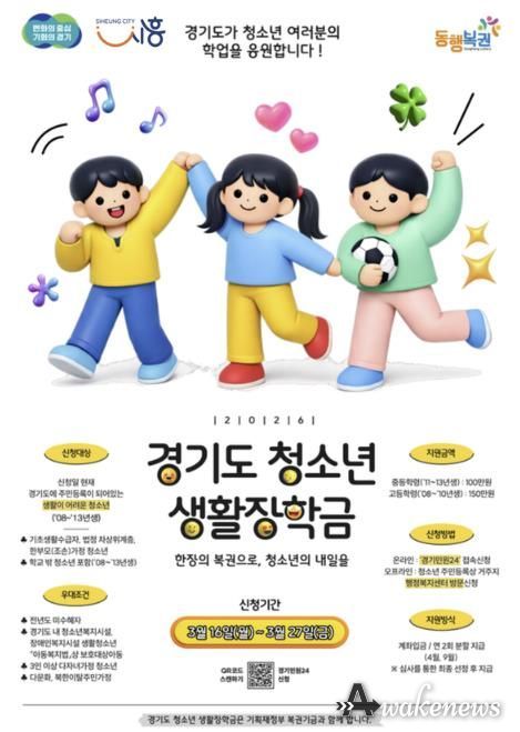 어웨이크뉴스 오경하 기자 | 시흥시는 경제적 어려움을 겪는 청소년들이 안정적으로 학업을 이어갈 수 있도록 지원하는 ‘청소년 생활장학금’ 대상자를 3월 16일부터 27일까지 모집한다.