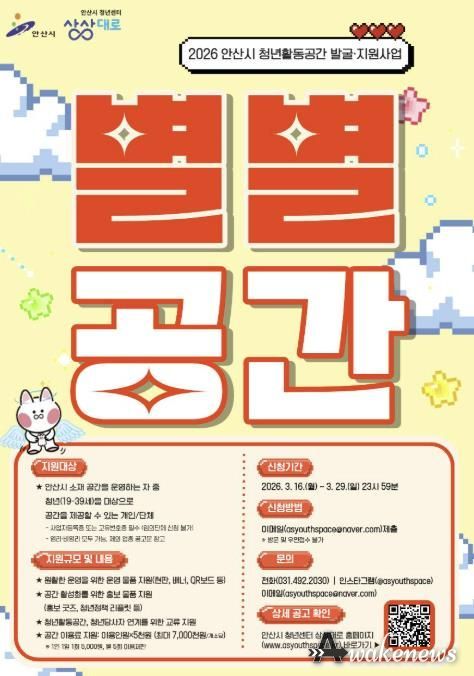 모집 대상은 안산시에 소재하고 사업자등록증을 보유한 공간 운영자다. 취업스터디 공간, 공방, 책방, 강의실, 문화예술 공간 등 청년 모임이 가능한 개인 또는 단체라면 누구나 신청할 수 있다.