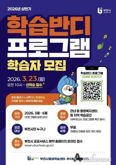 어웨이크뉴스 오경하 기자 | 부천시는 3월 23일 오전 10시부터 시민 누구나 생활권 가까운 곳에서 평생학습을 경험할 수 있도록 ‘2026년 상반기 학습반디 프로그램’ 41개 과정을 운영하고, 부천시 공공서비스예약 홈페이지를 통해 학습자를 선착순 모집한다.