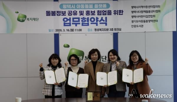 어웨이크뉴스 오경하 기자 | 평택복지재단은 2026년 3월 16일 팽성복지타운에서 평택시 관내 아동돌봄 관련 5개 유관기관과 '평택시 아동돌봄 플랫폼'의 안정적인 운영 및 활성화를 위한 업무협약(MOU)을 체결했다.