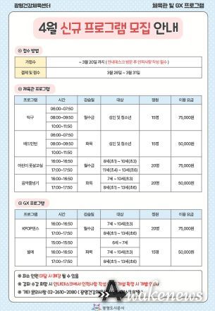 어웨이크뉴스 오경하 기자 | 광명도시공사는 광명건강체육센터에서 시민들의 건강 증진과 생활체육 활성화를 위해 체육관 및 GX실 4월 신규 프로그램 회원을 모집한다고 밝혔다.
