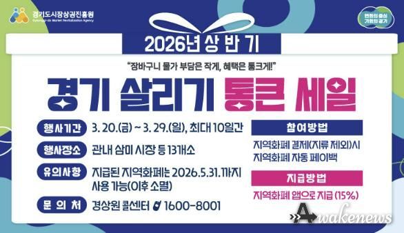 어웨이크뉴스 오경하 기자 | 시흥시는 고물가로 위축된 민생경제에 활력을 불어넣고 소상공인의 매출 증대를 돕기 위해 오는 3월 20일부터 29일까지 관내 전역에서 ‘2026년 상반기 경기 살리기 통큰 세일’을 개최한다.