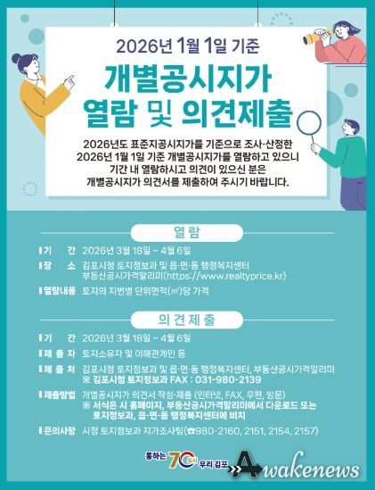 어웨이크뉴스 오경하 기자 | 김포시는 2026년 1월 1일 기준 개별공시지가(안)에 대하여 오는 3월 18일부터 4월 6일까지 열람을 실시하고 토지소유자 및 이해관계인의 의견을 접수한다고 밝혔다.