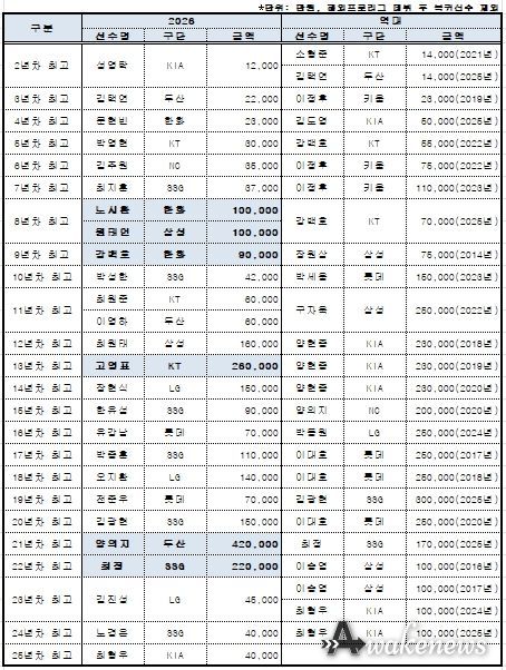 또한 2026시즌부터 시행되는 아시아쿼터 선수들의 연봉도 집계됐다. LG 웰스, SSG 타케다, 두산 타무라가 각각 20만 달러씩 받으며 아시아쿼터 선수 연봉(계약금 포함) 공동 1위에 올랐다.