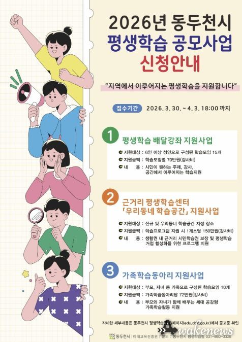 어웨이크뉴스 오경하 기자 | 동두천시는 시민들의 자발적인 학습 문화를 확산하고 지역 평생학습 공동체를 활성화하기 위해 ‘2026년 평생학습 공모사업’ 신청을 오는 3월 30일부터 4월 3일까지 접수한다고 밝혔다.
