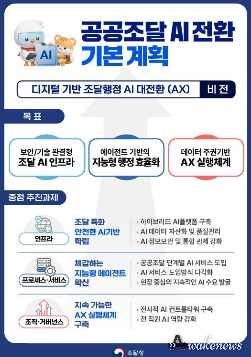 어웨이크뉴스 오경하 기자 | 조달청은 공공조달에서 활용가능한 AI 서비스의 지속적인 발굴과 안정적이고 체계적인 서비스 제공을 위해 '공공조달 AI 전환 기본계획'을 마련했다고 19일 밝혔다.