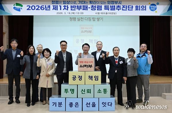 어웨이크뉴스 오경하 기자 | 의정부시는 3월 19일 시청 태조홀에서 시장을 비롯해 부시장, 국·소 및 권역국장, 부서장 등 간부 공무원 87명이 참석한 가운데 ‘반부패·청렴 특별추진단 회의’를 열고 ‘기분 좋은 선’ 청렴 실천 공동 선언과 함께 2026년 반부패·청렴도 향상 종합 추진계획을 공유했다.