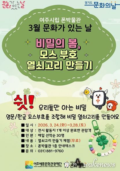 어웨이크뉴스 오경하 기자 | 여주세종문화관광재단이 운영하는 여주시립 폰박물관은 3월 '문화가 있는 날'을 맞아 오는 24일부터 28일까지 5일간 시민 참여형 행사 ‘비밀의 봄, 모스부호 열쇠고리 만들기’를 운영한다.