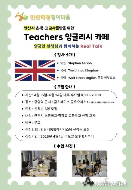 어웨이크뉴스 오경하 기자 | 안산시가 설립하고 안산대학교가 운영하는 안산화정영어마을은 ‘Teachers 잉글리시 카페’ 참여자를 모집한다고 23일 밝혔다.