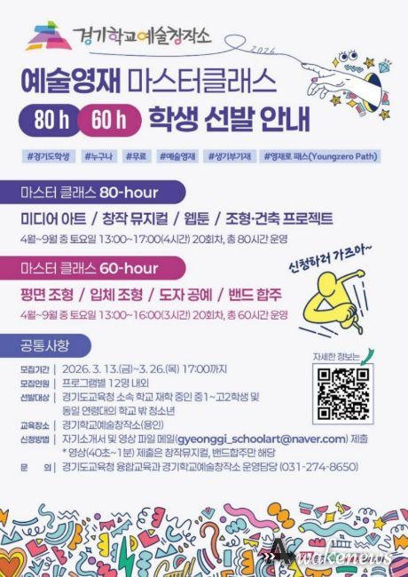 어웨이크뉴스 오경하 기자 | 경기도교육청이 미래 예술 인재 성장을 지원하는 전문 예술영재교육 프로그램인 ‘2026 예술영재 마스터 클래스 80·60-hour’참여 학생을 오는 26일까지 모집한다.