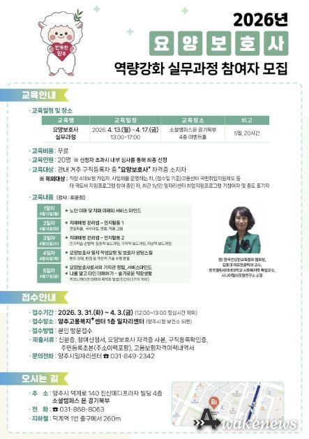 어웨이크뉴스 오경하 기자 | 양주시일자리센터가 오는 3월 31일부터 4월 3일까지 2026년 취업지원프로그램 ‘요양보호사 역량강화 실무과정’ 교육생을 모집한다.