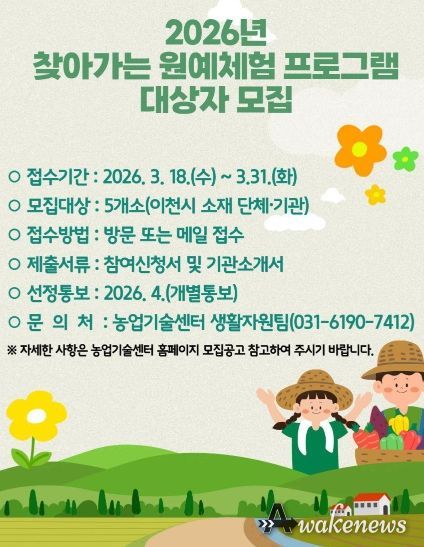 어웨이크뉴스 오경하 기자 | 이천시는 2026년 찾아가는 도시농업 원예체험 프로그램 대상자를 3월 31일까지 모집한다고 밝혔다.