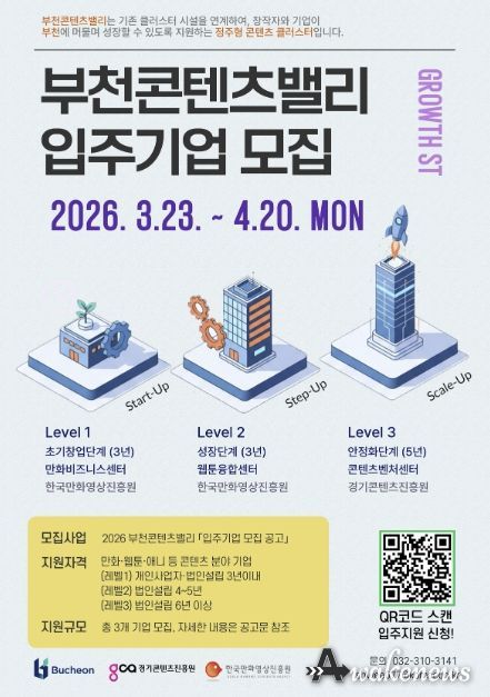 어웨이크뉴스 오경하 기자 | 부천시는 3월 23일부터 콘텐츠기업 성장 생태계 조성을 위해 경기콘텐츠진흥원, 한국만화영상진흥원과 협력해 기업 단계별 성장 지원과 산업 네트워크 강화를 추진하며 ‘부천콘텐츠밸리’ 사업 참여 기업을 모집한다.