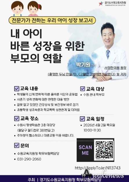수원교육지원청은 “이번 특강을 통해 학부모들이 자녀의 발달단계에 맞는 올바른 교육법을 습득하고, 과학적 근거에 기반한 올바른 건강 정보를 얻어 자녀의 성장을 지원하는 선순환 구조가 구축되기를 기대한다”고 밝혔다.